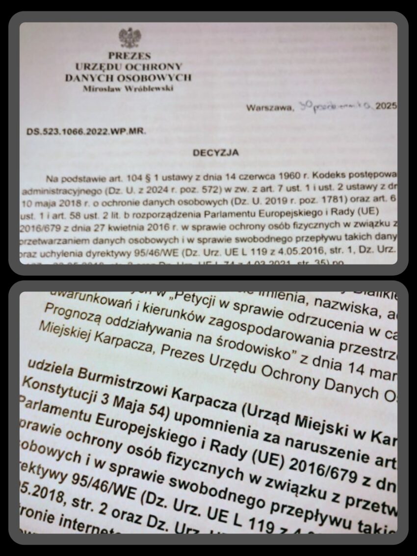 Prezes Urzędu Ochrony Danych Osobowych udzielił Burmistrzowi Karpacza upomnienia za ujawnienie danych osobowych bez podstawy prawnej!!!